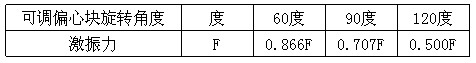 振動電機(jī)每端出軸均有一個固定偏心塊和一個可調(diào)偏心塊,調(diào)節(jié)可調(diào)偏心塊和固定偏心塊之間的夾角可改變激振力的大小。出廠時可調(diào)偏心塊和固定偏心塊之間的夾角為0度,這時的激振力為振動電機(jī)的額定激振力F,不同夾角時的激振力如表:
